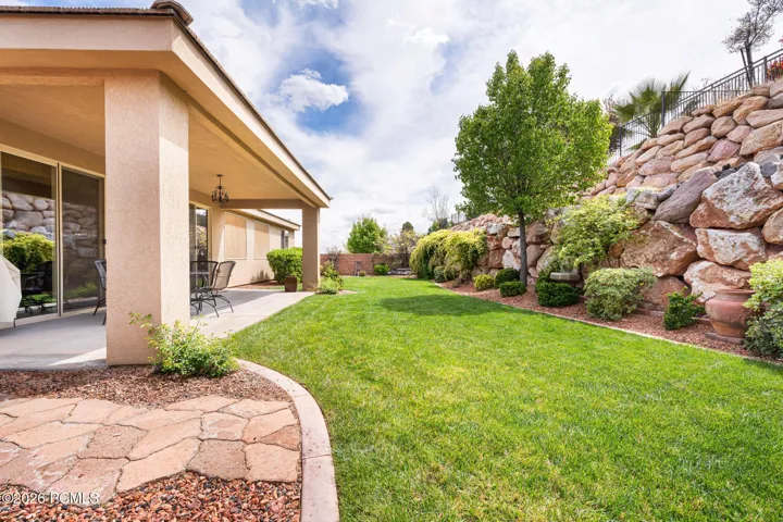 This beautifully maintained home in the desirable Primrose Point subdivision, located directly across the street from the scenic Virgin River Trail, offering easy access to walking, biking, and outdoor enjoyment right from your front door. A furniture package is available for buyers looking for a turnkey option. This 3 bedroom/office move-in ready home has been lightly lived in and shows pride of ownership throughout, situated in a quiet, well-kept neighborhood. Inside, you’ll find a bright and inviting layout with updated paint, newer carpet and padding, upgraded light fixtures, ceiling fans, woven wood blinds, and plantation shutters that add warmth and style throughout the home. The entry features an elegant coffered ceiling, and the spacious living areas feel open and comfortable. The kitchen offers granite countertops, KitchenAid gas range/oven, GE microwave, dishwasher, updated disposal and brand-new Bosch refrigerator, and abundant cabinet space, along with a laundry room sink and additional storage cabinets for convenience. The refrigerator, washer, dryer and patio set are included, making this home truly move-in ready. The primary suite features dual vanities, a soaking tub, and a walk-in shower and roomy walk-in closet, creating a relaxing retreat. Additional updates include some newer windows, updated faucets, and a newer patio perfect for outdoor living. The yard is fully fenced and beautifully landscaped with roses, and mature wisteria shrubs, creating a peaceful outdoor setting. The home has never had pets or smoking and has been exceptionally cared for. Enjoy the perfect combination of location, condition, and comfort in this lovely Primrose Point home, just steps from the Virgin River Trail.